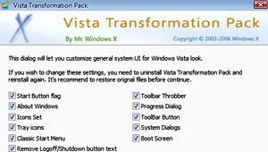 Trong quá trình cài đặt, bạn có thể tùy chọn các yếu tố giao diện muốn thay đổi, chẳng hạn như biểu tượng, khay hệ thống và màn hình khởi động. Lưu ý, nếu muốn điều chỉnh các cài đặt này sau này, bạn nên gỡ bỏ Vista Transformation, cài đặt lại và khôi phục các file gốc.