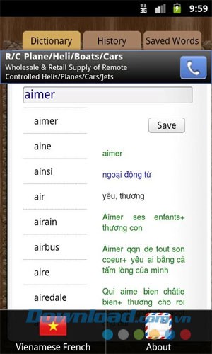 VM Từ điển Việt Pháp là ứng dụng từ điển Việt - Pháp offline, hoàn toàn miễn phí với hơn 47.000 từ Pháp - Việt và gần 40.000 từ Việt - Pháp. Ứng dụng hỗ trợ tra cứu nhanh chóng và tiện lợi mà không cần kết nối internet.