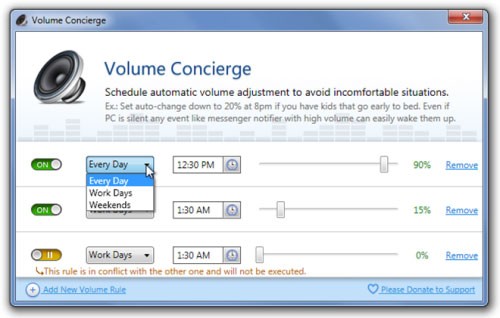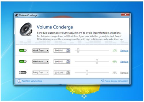Volume Concierge 1.0.1 được thiết kế để tự động thay đổi mức âm lượng trên máy tính vào những thời điểm được cài đặt trước, giúp tránh những âm thanh đột ngột gây khó chịu, đặc biệt là vào ban đêm.