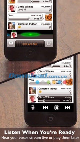 Mở danh sách trò chuyện, chọn Chat, nhấn và giữ nút "Hold and Talk" để bắt đầu ghi âm. Thả ngón tay ra khi tin nhắn audio hoàn tất. Tin nhắn sẽ được gửi ngay lập tức đến người nhận trong khi bạn đang nói.