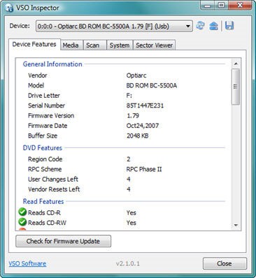 VSO Inspector 2.1.0.6 là một tiện ích nhỏ gọn, được thiết kế để cung cấp cho người dùng những thông tin chi tiết về phần cứng của các thiết bị đọc và ghi CD/DVD được kết nối với máy tính.