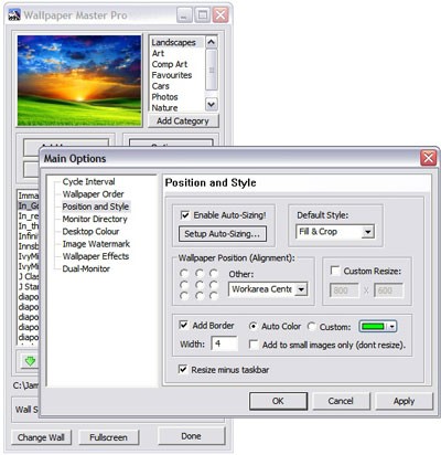 Wallpaper Master Pro là một ứng dụng chuyên dụng, hỗ trợ người dùng trong việc quản lý hình nền trên máy tính để bàn. Phần mềm này cung cấp khả năng thiết lập thời gian thay đổi ảnh nền một cách tự động, hoặc thay đổi ngay khi hệ thống khởi động.
