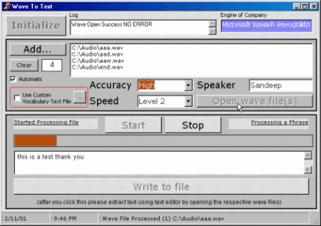 Wave To Text là một chương trình được thiết kế để nhận diện giọng đọc tiếng Anh từ các tập tin *.WAV và chuyển đổi chúng thành văn bản . Với kết quả thu được, người dùng có thể tự đánh giá trình độ nghe của bản thân hoặc sử dụng nó như một nguồn tài liệu tham khảo.