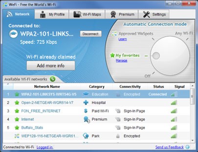 Đặc biệt, WeFi có khả năng tự động kết nối đến một điểm truy cập không dây đã được chỉ định trước, cũng như hỗ trợ tìm kiếm mạng Wi-Fi ở các khu vực khác.