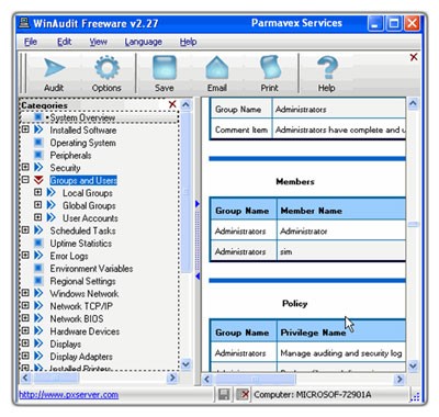 Khởi động chương trình, sau đó chọn công cụ Options. Một cửa sổ Select Categories for Auditing sẽ hiện ra, hãy chọn All để đánh dấu tất cả các mục và nhấn Apply. Quay trở lại giao diện chính, bấm vào nút Audit. Quá trình quét sẽ diễn ra và kết quả báo cáo chi tiết sẽ được hiển thị.