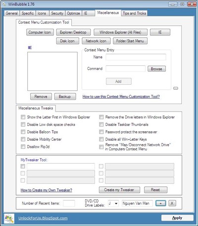 Một tính năng đặc biệt của WinBubble là khả năng tạo nhãn cho ổ đĩa CD, DVD. Bạn chỉ cần chọn tên ổ đĩa, đặt nhãn và nhấp dấu (+), ổ đĩa sẽ luôn hiển thị nhãn bạn đã đặt (khác với tên đĩa).