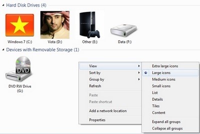 Để biểu tượng hiển thị rõ ràng và lớn hơn, bạn có thể kích chuột phải vào một khoảng trống bất kỳ trong cửa sổ My Computer. Tiếp theo, chọn View -> Large icons (hoặc Extra large icons để có kích thước lớn nhất).