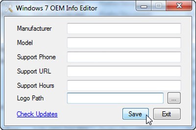 Sau khi hoàn tất việc tải xuống Windows 7 OEM Info Editor, bạn chỉ cần khởi chạy file thực thi Windows7OemInfoEditor.exe để mở chương trình. Tại giao diện chính, nhập các thông tin bạn mong muốn hiển thị trong System Properties. Cụ thể:
