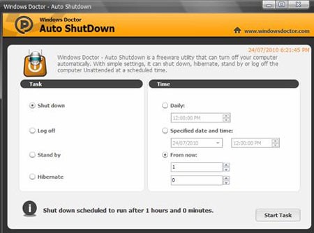 Auto Shutdown: Giúp người dùng thiết lập các thao tác: tắt, khởi động lại, chờ, ngủ đông theo lịch thời gian tùy biến (hỗ trợ thiết lập theo giờ, ngày và một mốc thời gian cố định). Nhấp nút Start Task để xác nhận các thiết lập.