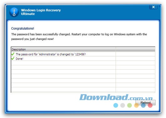 Sau khi thay đổi mật khẩu Windows thành công, tháo CD/DVD hoặc USB ra khỏi máy tính và nhấn Reboot. Chọn Yes để khởi động lại máy tính và đăng nhập bằng mật khẩu mới.