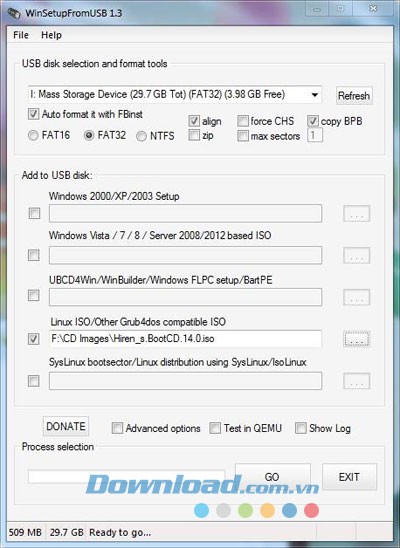Trong WinSetupFromUSB, bạn hãy chọn tùy chọn phù hợp với nhu cầu của mình, sau đó nhấn nút GO và chờ đợi chương trình hoàn tất việc tạo USB boot.