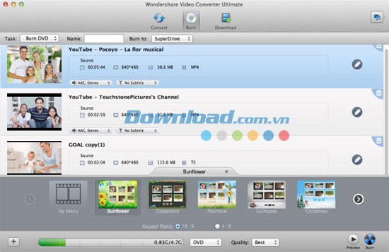 Ghi bất kỳ định dạng video nào như MOV, MKV, MP4, AVI, WMV, MTS, thậm chí cả video HD sang DVD. Thêm vào đó, 10 mẫu menu DVD mới được tích hợp để bạn có thể tạo ra những DVD mang phong cách cá nhân.