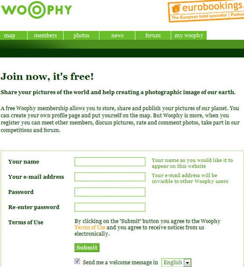Để tận hưởng tất cả các tiện ích mà Woophy mang lại, bạn nên đăng ký một tài khoản bằng cách nhấp vào nút Register. Quá trình đăng ký rất đơn giản, bạn chỉ cần cung cấp địa chỉ email của mình.