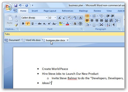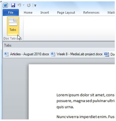 Doc Tabs là một công cụ hữu ích giúp bạn quản lý nhiều tài liệu Word trong một cửa sổ duy nhất, đặc biệt hữu ích khi bạn cần sao chép nội dung giữa các tài liệu. Tiện ích này hoạt động tốt nhất trên Word 2007 và vẫn có thể sử dụng được trên Word 2010.