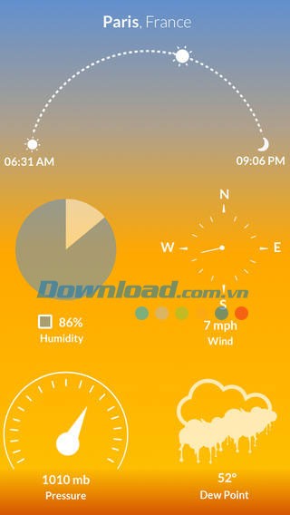 Ứng dụng cung cấp các thông tin thời tiết hữu ích như độ ẩm, hướng và tốc độ gió, điểm sương, áp suất và tầm nhìn xa, được trình bày với hiệu ứng động hấp dẫn.