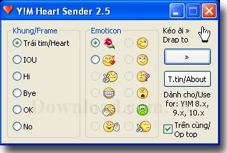 Y!MHeartSender cho phép bạn gửi đến người trò chuyện những biểu tượng mặt cười được sắp xếp thành các khung hình ấn tượng. Bạn có thể tạo ra những hình trái tim từ những bông hoa hồng, hay dòng chữ "I Love You" được ghép từ những nụ hôn.