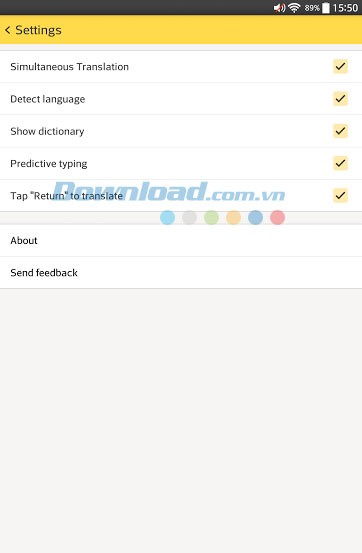 Phần cài đặt của Yandex.Translate cung cấp nhiều tùy chọn hữu ích, bao gồm: dịch thuật ngay khi nhập liệu, tự động nhận diện ngôn ngữ, hiển thị từ điển, gợi ý nhập liệu, sử dụng phím Return để dịch, và thông tin về nhà phát triển cũng như chức năng gửi phản hồi.