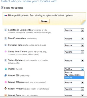 Tính năng cập nhật trạng thái mạng xã hội là một điểm mới đáng chú ý của Yahoo Messenger 10. Trong thẻ Y! Updates, bên cạnh Contacts, bạn có thể xem các cập nhật từ bạn bè trên các mạng xã hội như Twitter, last.fm, Flickr hoặc blog Yahoo! 360 Plus.