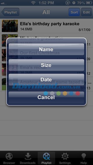 Sắp xếp video theo tên, dung lượng hoặc ngày tạo.
