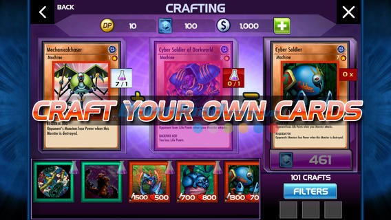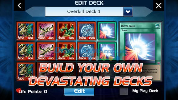 Vươn lên đỉnh cao trở thành Master Duelist bằng cách tạo ra một bộ bài không ai có thể sánh bằng, tự do lựa chọn từ hơn 500 lá bài Yu-Gi-Oh! gốc và huyền thoại! Nâng cấp bộ bài của bạn bằng cách kết hợp các lá bài chưa từng sử dụng để tạo ra những lá bài mạnh mẽ và hiếm có hơn. Thách đấu bạn bè và đối thủ để chiếm lấy Duel Arena bằng kỹ năng và kinh nghiệm của bạn!