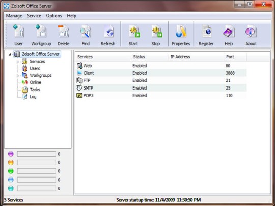 Zolsoft Office Server là một bộ phần mềm hoàn chỉnh, bao gồm Web server, client server, FTP server, SMTP server và POP3 server. Ứng dụng này cho phép phân chia người dùng thành các nhóm làm việc (workgroup) và tạo các thư mục riêng biệt cho mỗi nhóm.