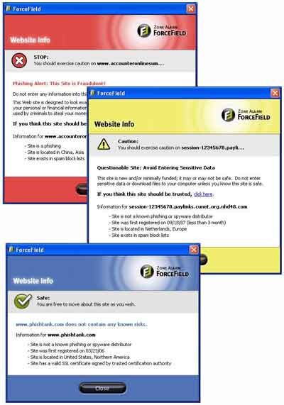 ZoneAlarm ForceField ngăn chặn các chương trình độc hại như Trojan, virus và mã độc khác tác động trực tiếp đến Registry hoặc hệ thống tập tin quan trọng. Đồng thời, nó chủ động phát hiện và cảnh báo về các trang web lừa đảo (phishing) bằng cách nhận diện các hành vi nguy hiểm như keylogging, screenlogging và tải xuống phần mềm độc hại.
